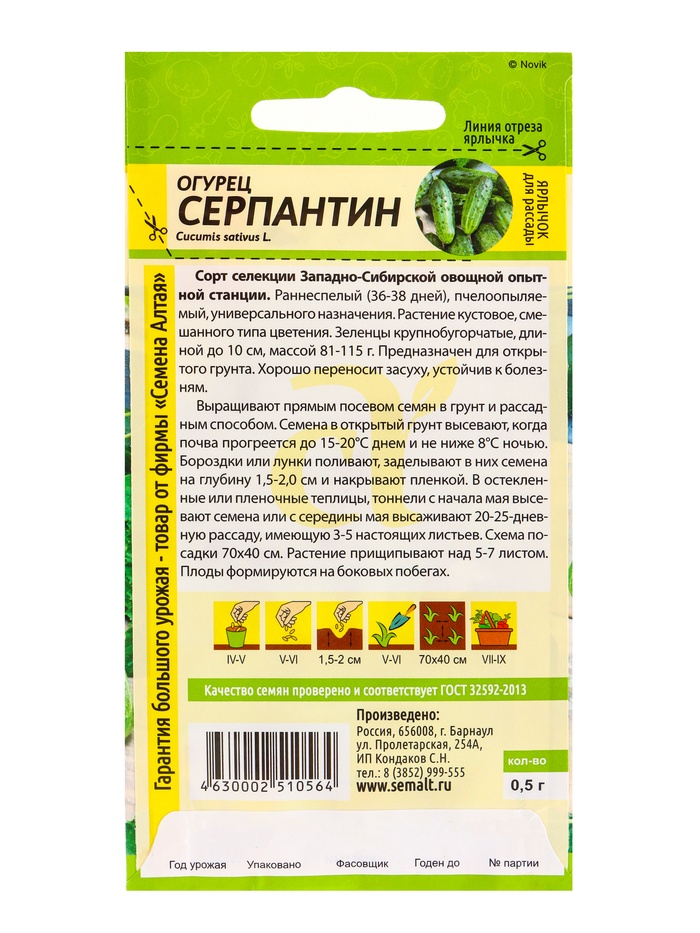 Набор семян Огурец "Серпантин", Сем. Алт, , 5 шт. — Характеристики