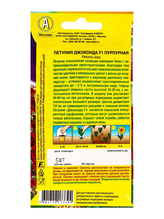 Набор семян Петуния "Джоконда", F1, пурпурная, драже в пробирке, 4 шт. — Характеристики