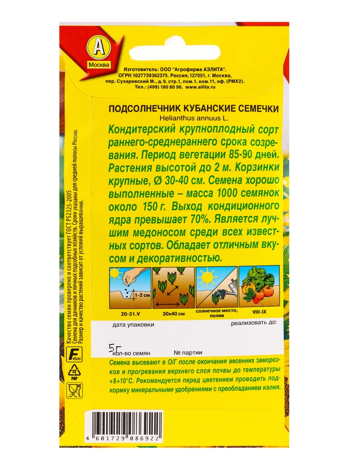 Набор семян Подсолнечник "Кубанские семечки", 5 шт. — Характеристики