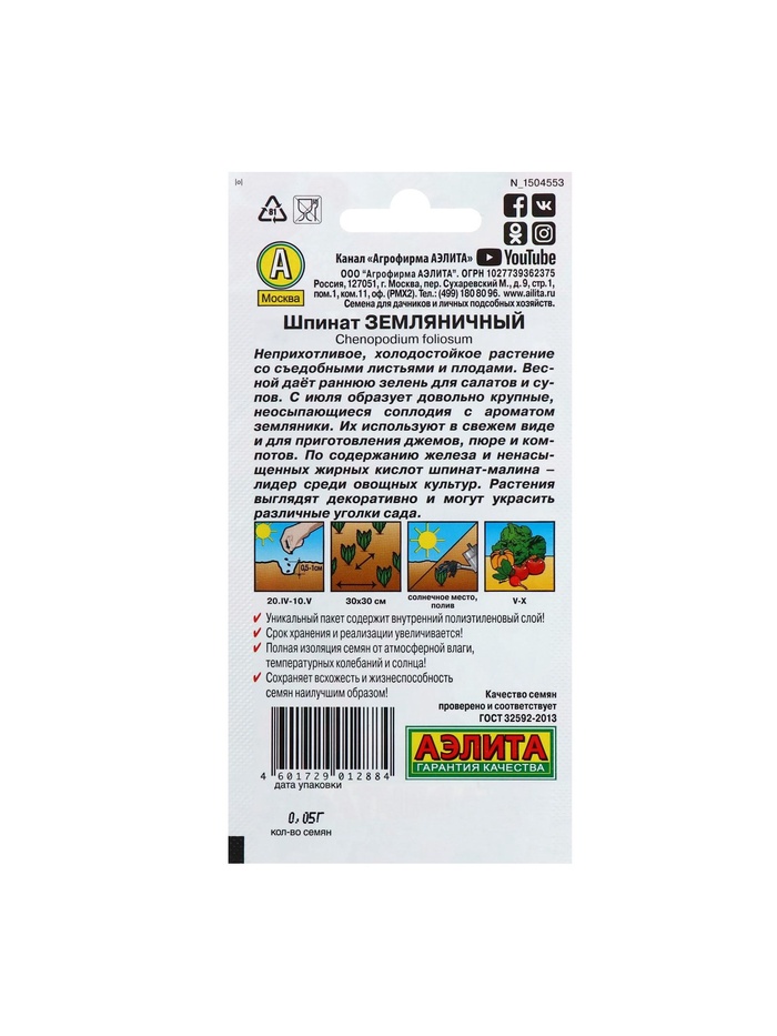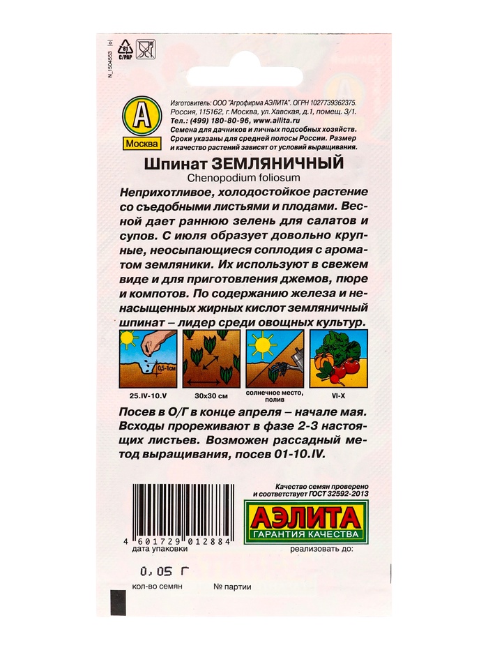 Набор семян Шпинат "Земляничный", 5 шт. — Характеристики