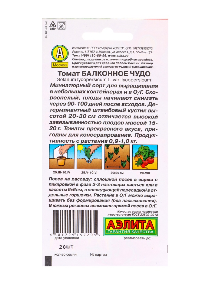 Набор семян Томат "Балконное чудо", детерминантный,низкорослый, 5 шт. — Характеристики