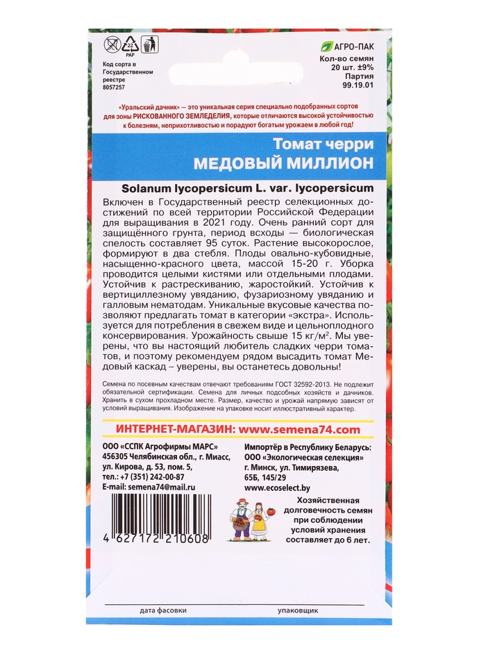 Набор семян Томат "Медовый миллион", черри, 5 шт. — Характеристики