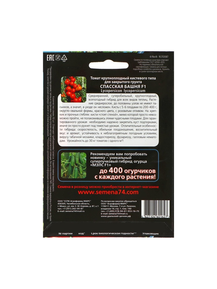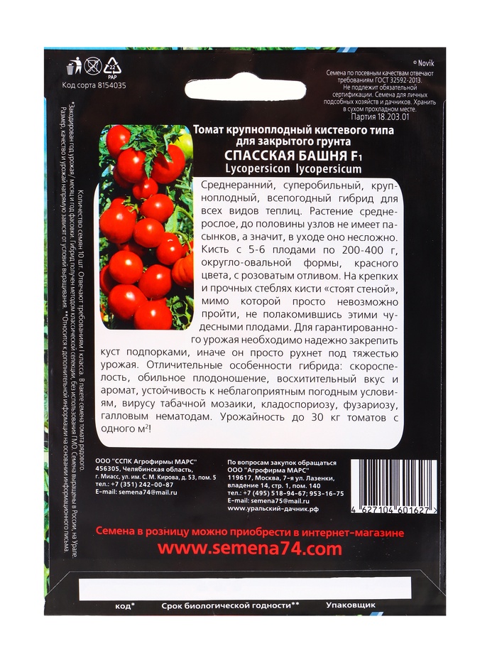 Набор семян Томат "Спасская Башня" F1 крупноплодный, среднеранний, 3 шт. — Характеристики