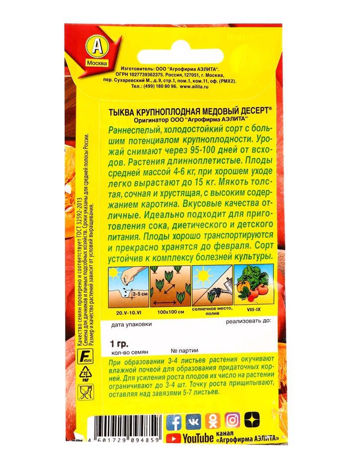 Набор семян Тыква крупноплодная "Медовый десерт", 5 шт. — Характеристики