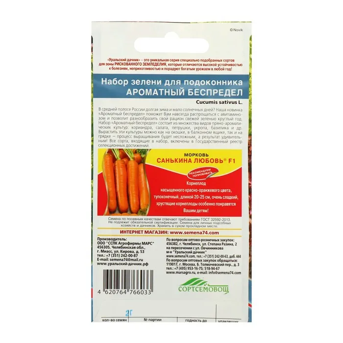 Набор «Ароматный беспредел» состоит из множества видов пряно-ароматических культур: кориандра, салата, петрушки, укропа, базилика и др. Вырастить эти культуры можно как на окошке, в балконном ящике, так и на грядке — процесс выращивания будет несложным, а результат удивительным! Все сорта, входящие в набор, включены в Государственный реестр селекционных достижений.
