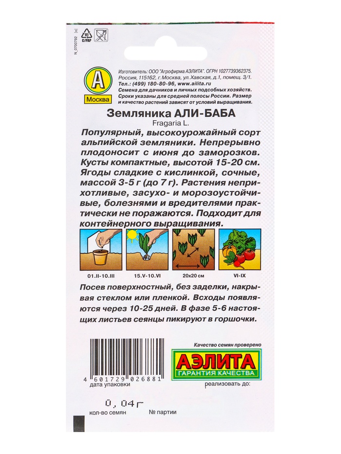 Набор семян Земляника "Али Баба" ремонтантная, 5 шт. — Характеристики