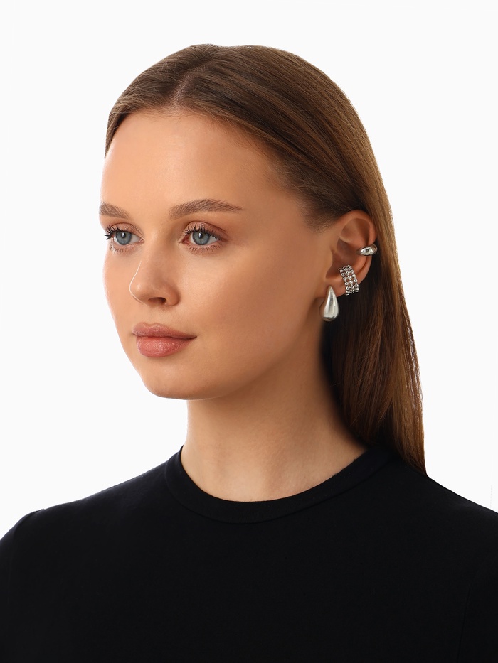 Откройте для себя мир стильных аксессуаров с набором серьг и каффов, который станет вашим верным спутником в создании уникальных образов. Эти элегантные украшения в серебристом цвете с каплеобразным дизайном добавят нотку изысканности и современности в ваш гардероб, позволяя вам выделяться среди толпы.