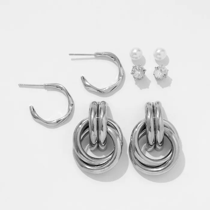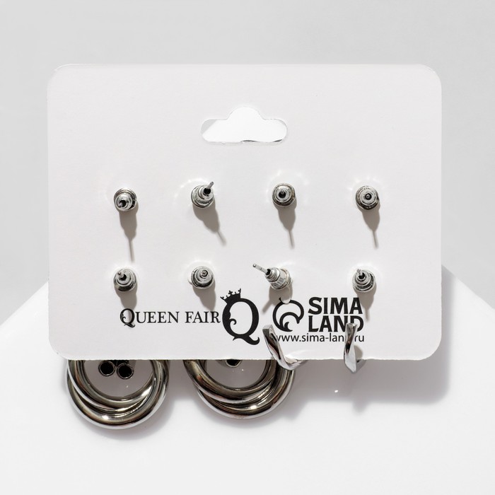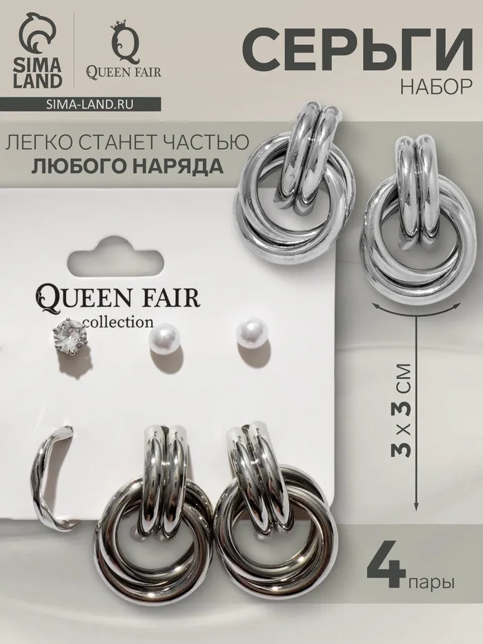 Набор серег QF «Летние истории», 4 пары, кольца и плетение, цвет белый в серебре — Характеристики