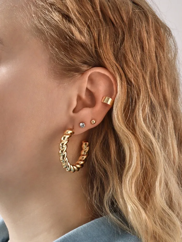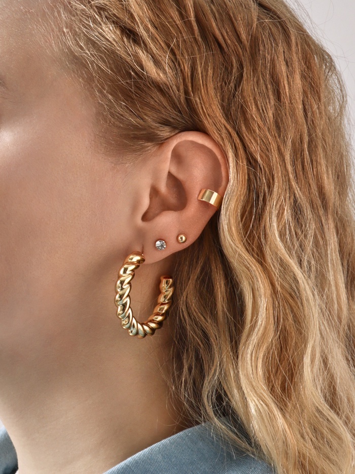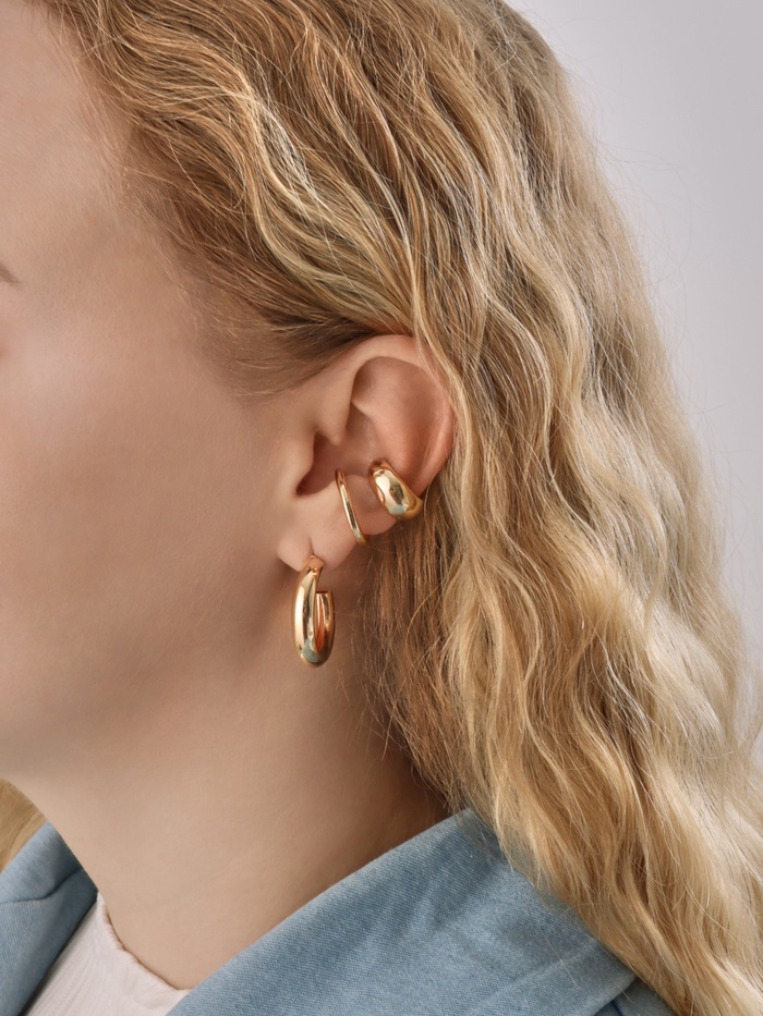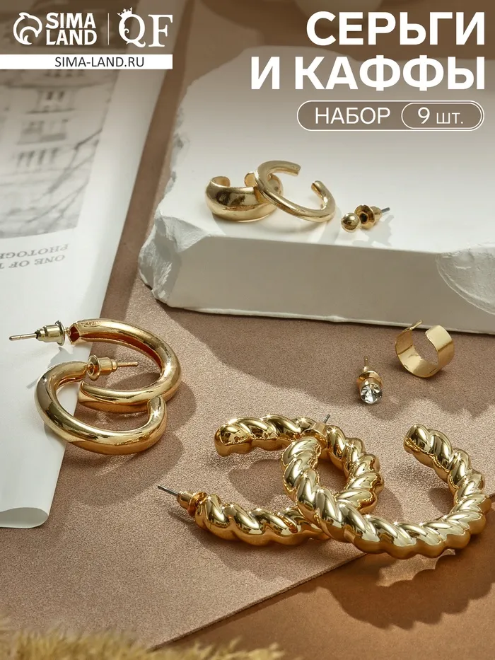 Каждое изделие выполнено из качественного металла, длина серьг составляет 8,5 см, а застёжка пусет (гвоздик) обеспечивает надежную фиксацию. Каффы, которые не требуют прокола, делают этот набор идеальным для тех, кто предпочитает комфорт и стиль в одном флаконе. Золотистый цвет фурнитуры придаёт украшениям элегантный вид, а отсутствие вставок позволяет легко сочетать их с любым нарядом.