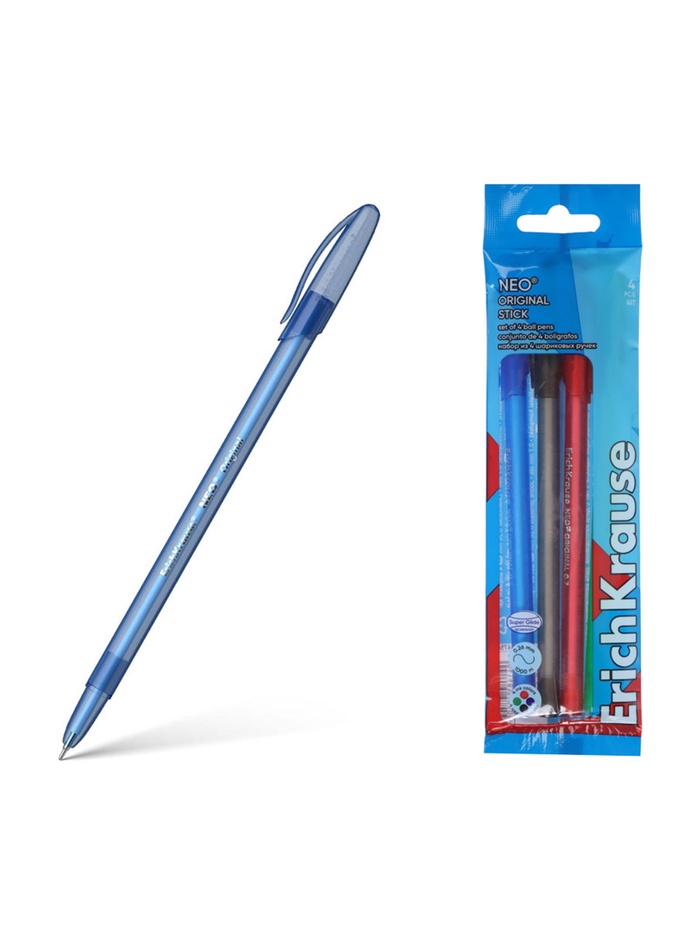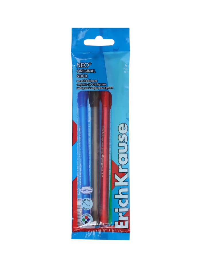 Набор шариковых ручек ErichKrause Stick Original, 4 штуки, узел 0.7 мм, чернила микс, супермягкое письмо, длина линии письма 1000 метров, МИКС — Характеристики