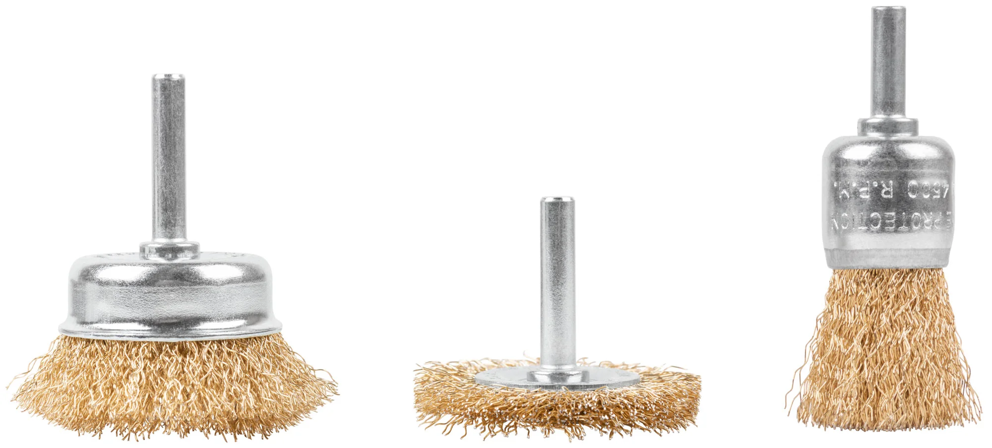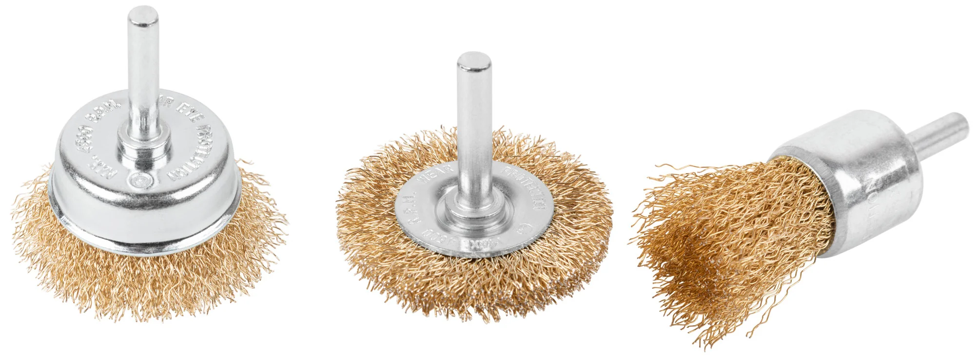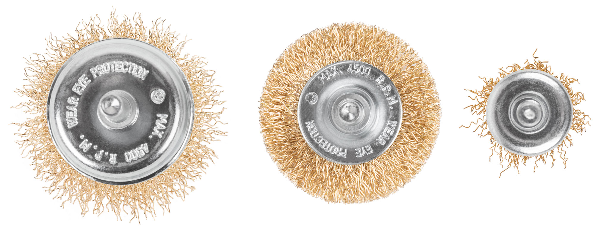 Щетки выполнены из латунированной витой проволоки, что обеспечивает долговечность и высокую эффективность при работе. Чашечные щетки (25 и 50 мм) обладают хорошей площадью прилегания, а плоская щетка 50 мм идеально подходит для труднодоступных мест, таких как углы и пазы.