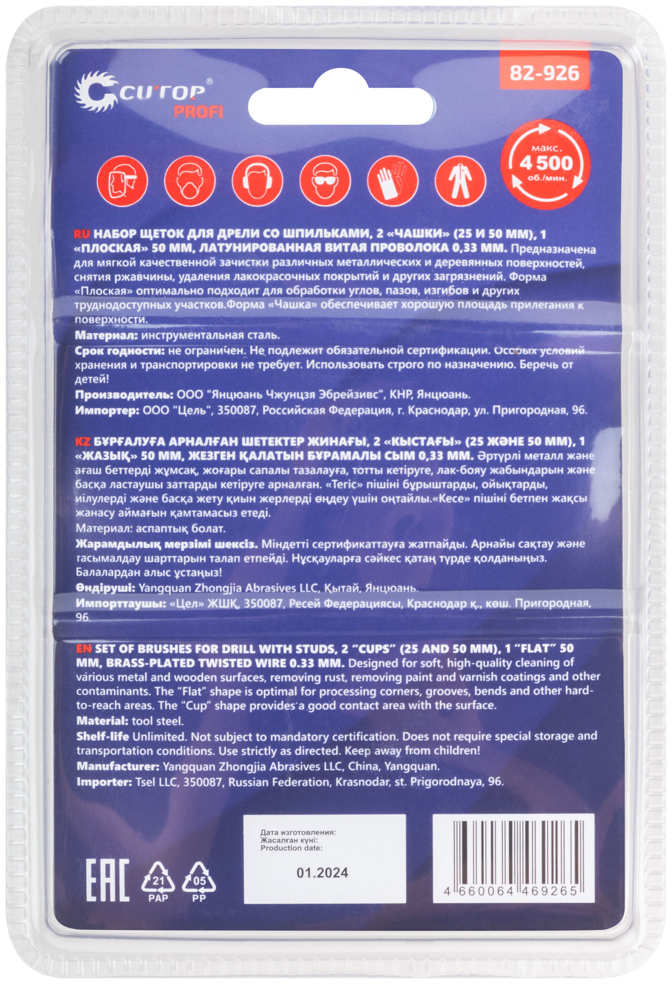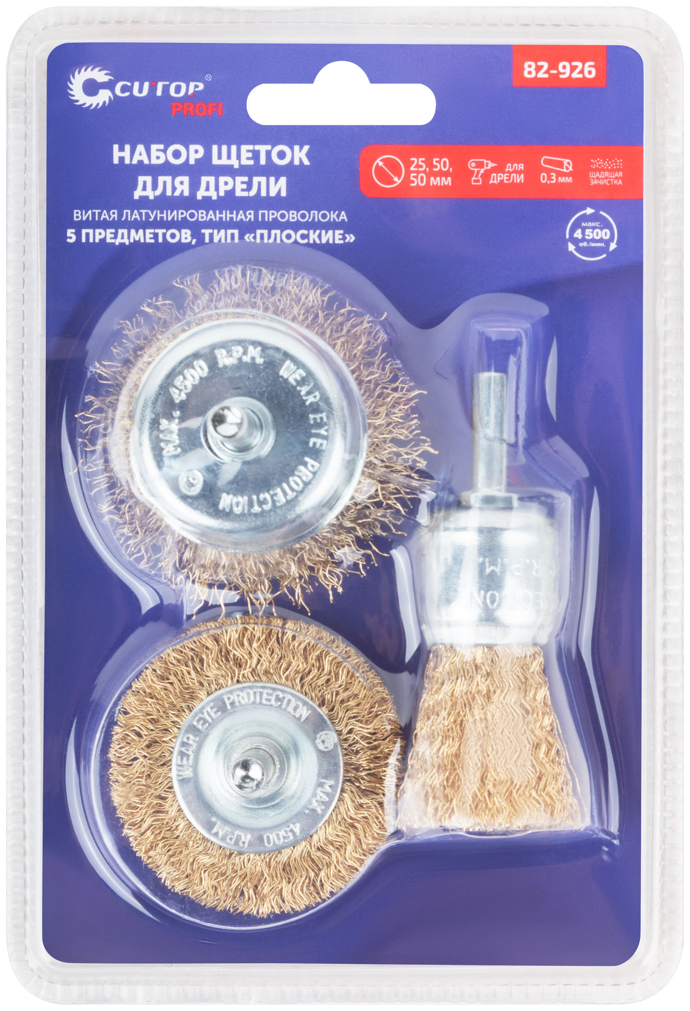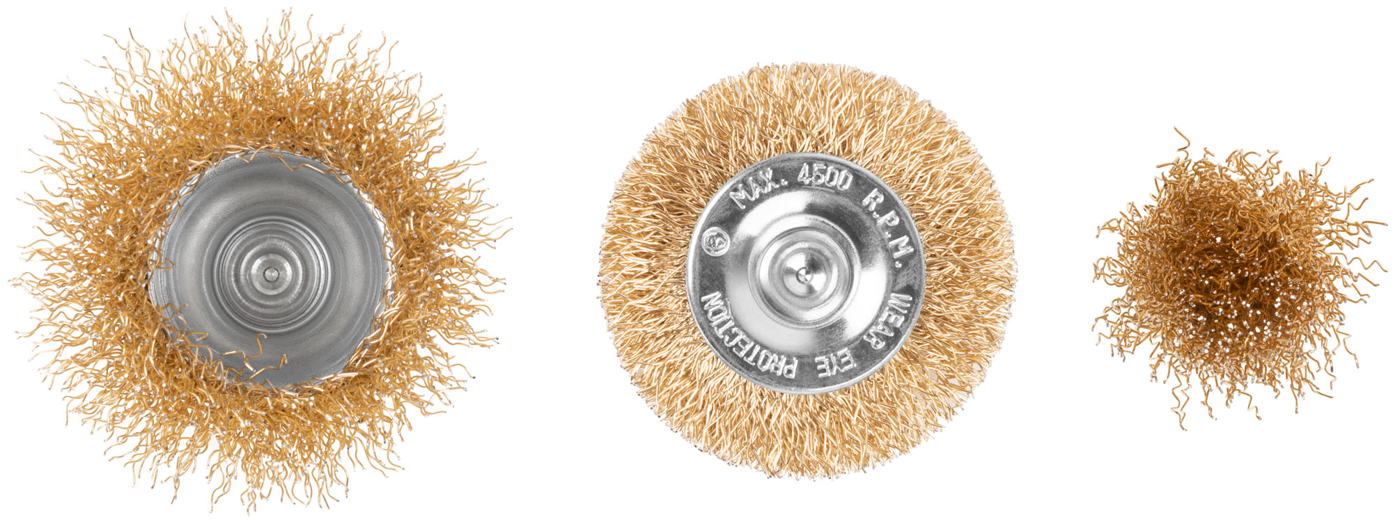 Щетки выполнены из латунированной витой проволоки, что обеспечивает долговечность и высокую эффективность при работе. Чашечные щетки (25 и 50 мм) обладают хорошей площадью прилегания, а плоская щетка 50 мм идеально подходит для труднодоступных мест, таких как углы и пазы.