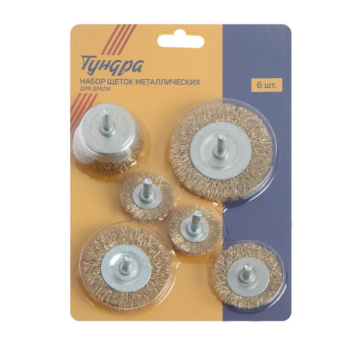 Набор щеток металлических для дрели ТУНДРА, плоские 40-50-65-75-100 мм, чашка 50 мм, 6 шт. — Характеристики