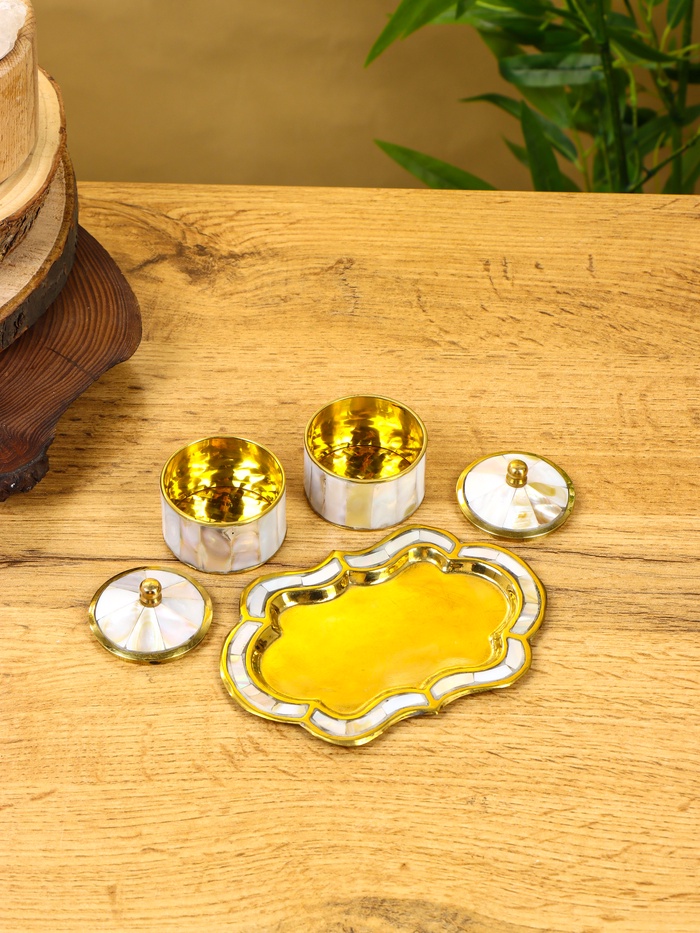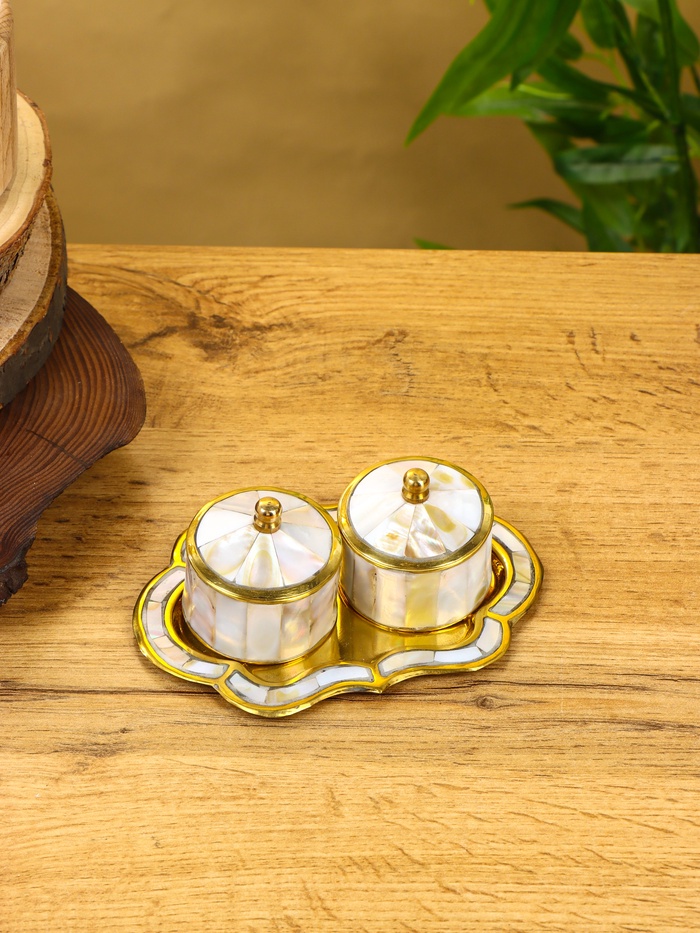 Набор шкатулок «Сокровища Агры» — изысканное решение для хранения мелких драгоценностей: серёжек, колец, браслетов или любимых воспоминаний. Латунная основа с перламутровыми вставками переливается в свете, как заря на стене старинного дворца, а компактная тарелочка объединяет всё в единый ансамбль. Такой набор уместен и на туалетном столике, и в шкатулке для подарков — он не требует повода, чтобы радовать глаз.