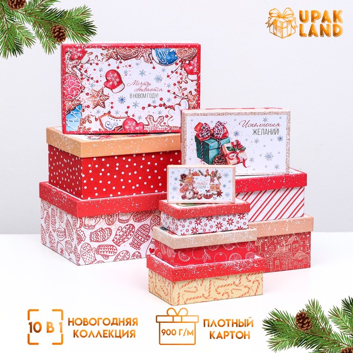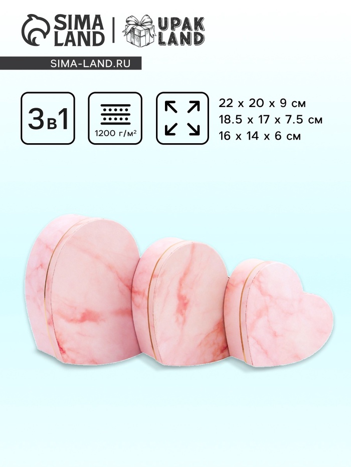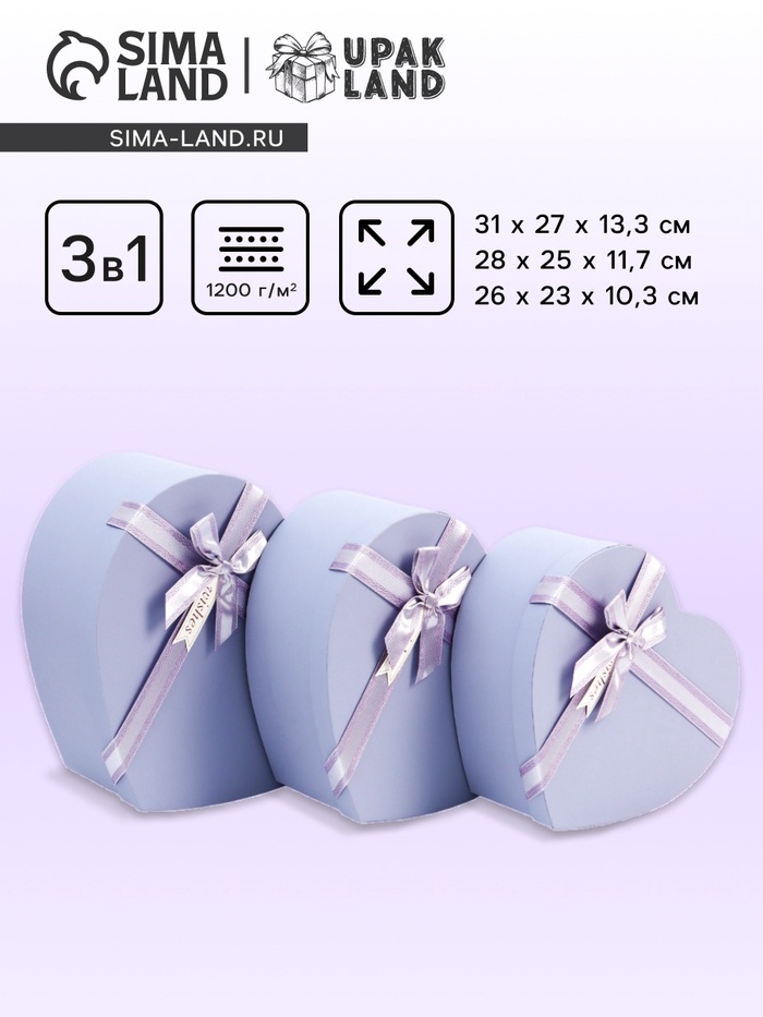 Каждая коробка имеет свой размер, что позволяет упаковать в нее различные предметы. Например, вы можете положить в одну коробку сладости, в другую – косметику, а в третью – книгу или другой полезный подарок.