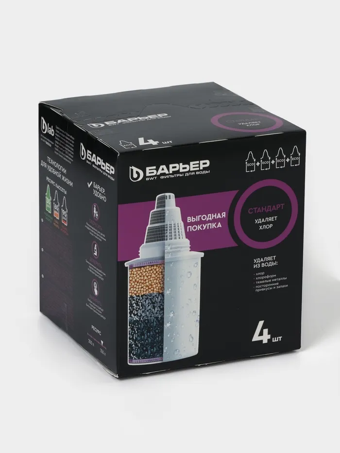 Сменные картриджи «Барьер 4. Стандарт» предназначены для доочистки питьевой водопроводной воды от хлора, хлорорганики, тяжёлых металлов, пестицидов, ПАВ и нефтепродуктов. Герметичная резьба исключает проникновение неочищенной воды в отфильтрованную.