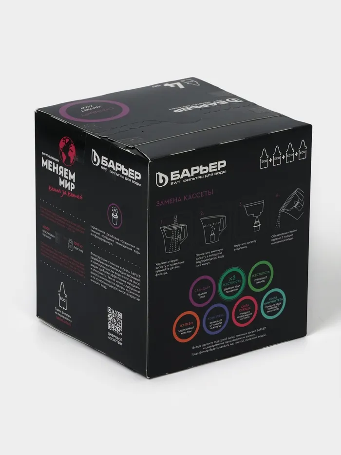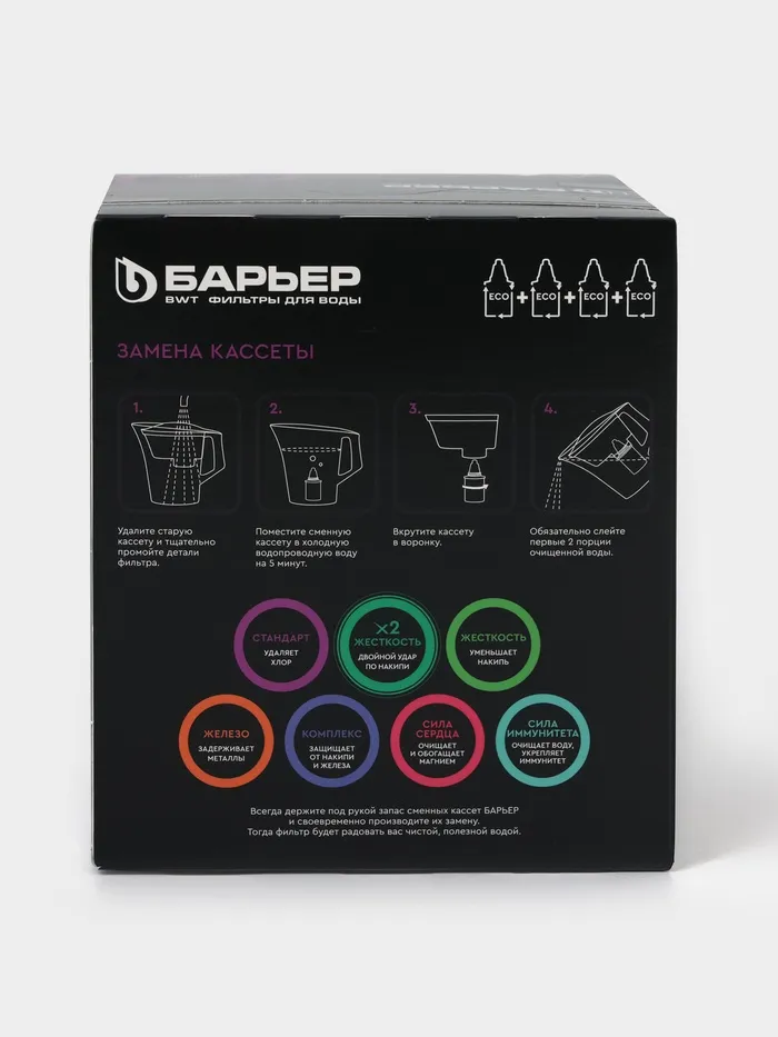 Сменная кассета «Барьер. Стандарт» подходит к любым фильтрам-кувшинам марки «Барьер». Ресурс — 350 литров.