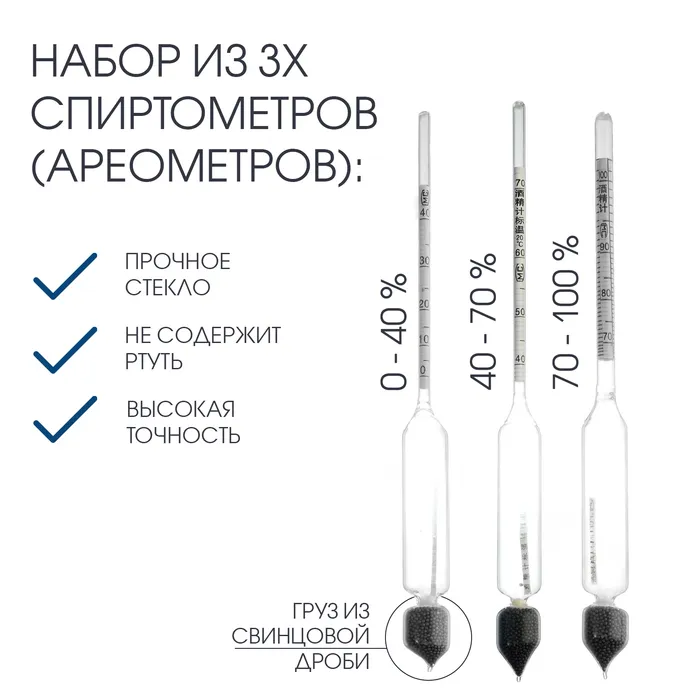 Набор из 3 спиртометров в комплекте с термометром предназначен для максимально точного определения объёмной доли этилового спирта в водных растворах в диапазоне от 0 до 100 %. Если соблюдать все условия использования приборов, то погрешность будет составлять не более 0,5 %.