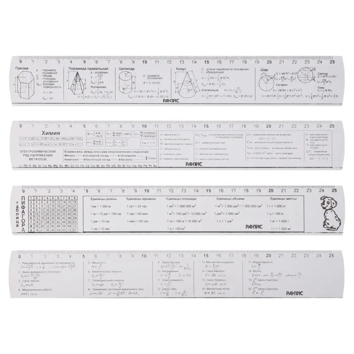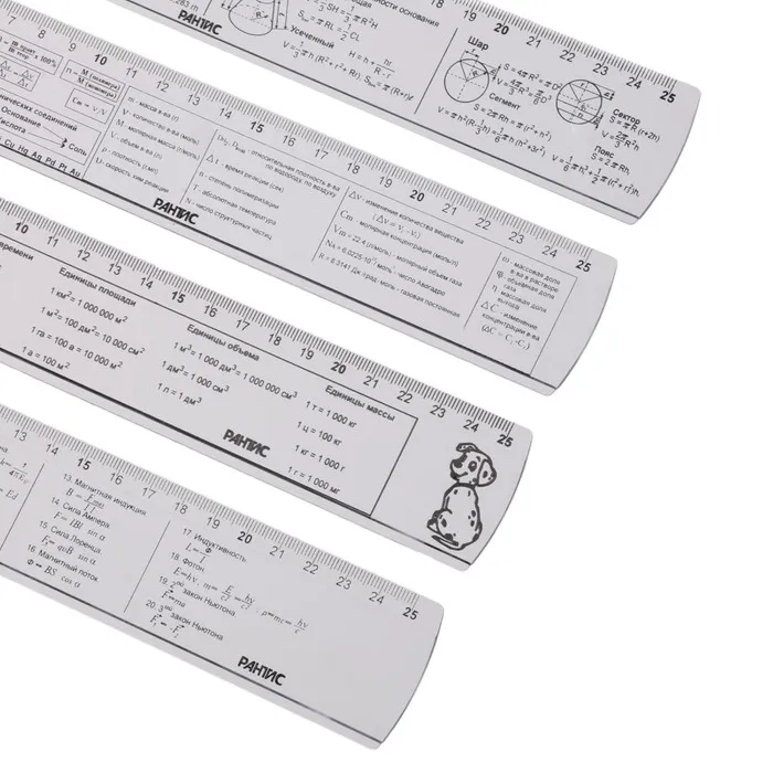 Набор справочных линеек Calligrata – отличный помощник для создания ровных линий. Широкие линейки–шпаргалки выпускается с справочными материалами по алгебре, химии, геометрии, физике. Чёткое нанесение информации. Размер товара – 25 см, ширина – 35 мм. Изделие имеет гладкую глянцевую поверхность