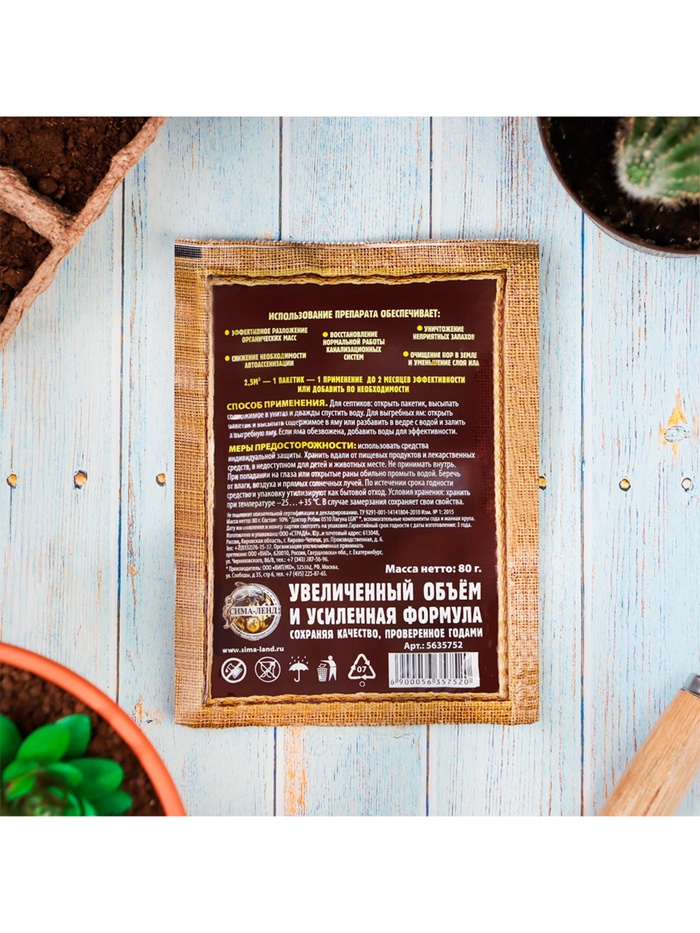 • Для выгребных ям: открыть пакетик и высыпать содержимое в яму или разбавить в ведре с водой и залить в выгребную яму. Если яма обезвожена, добавить воды для эффективности.