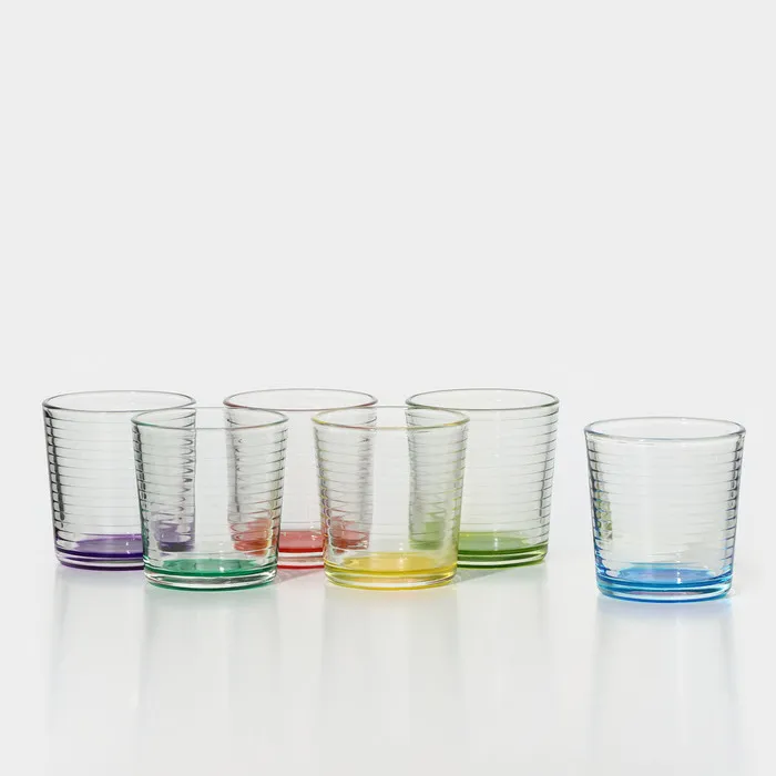 Набор стаканов для напитков состоит из 6 шт, объём 250 мл. Разноцветные стаканы сделаны из толстого качественного стекла. Набор стаканов идеально подходит для воды, сока, виски, коктейлей. Такие яркие стаканы поднимут вам и вашим гостям настроение.