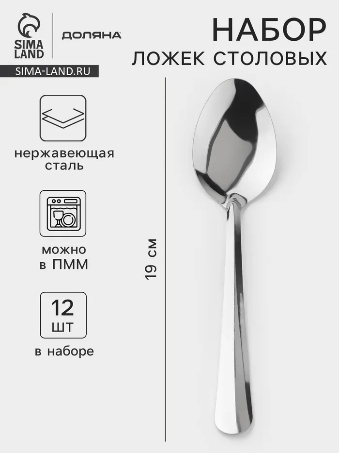 Набор столовых ложек Доляна «Оптима», длина 19 см, набор 12 шт., нержавеющая сталь, серебристый — Характеристики