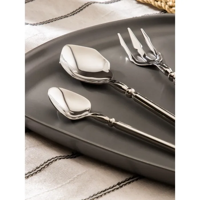 Этот набор столовых приборов добавит нотку изящества как повседневному, так и праздничному столу, так как имеют необычный дизайн. Каждый предмет гладко отполирован, а зеркальный блеск гармонично дополняет предмет. Отлично сбалансированы, удобно лежат в руке и приятны на ощупь.
