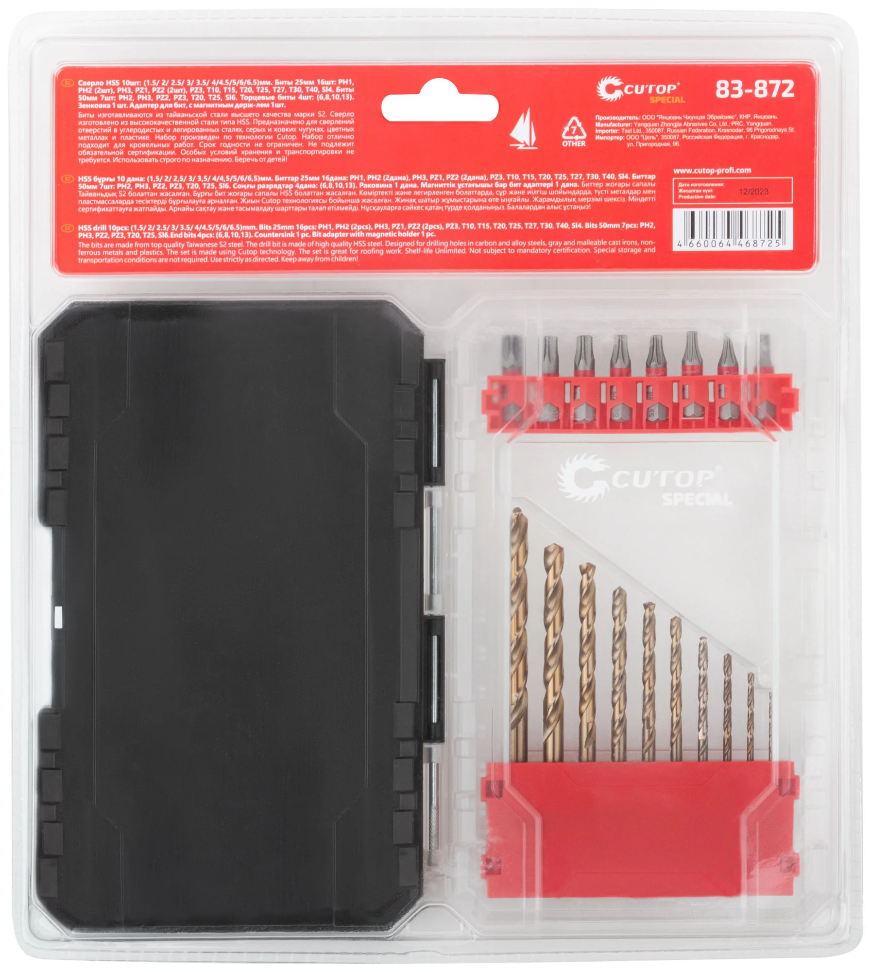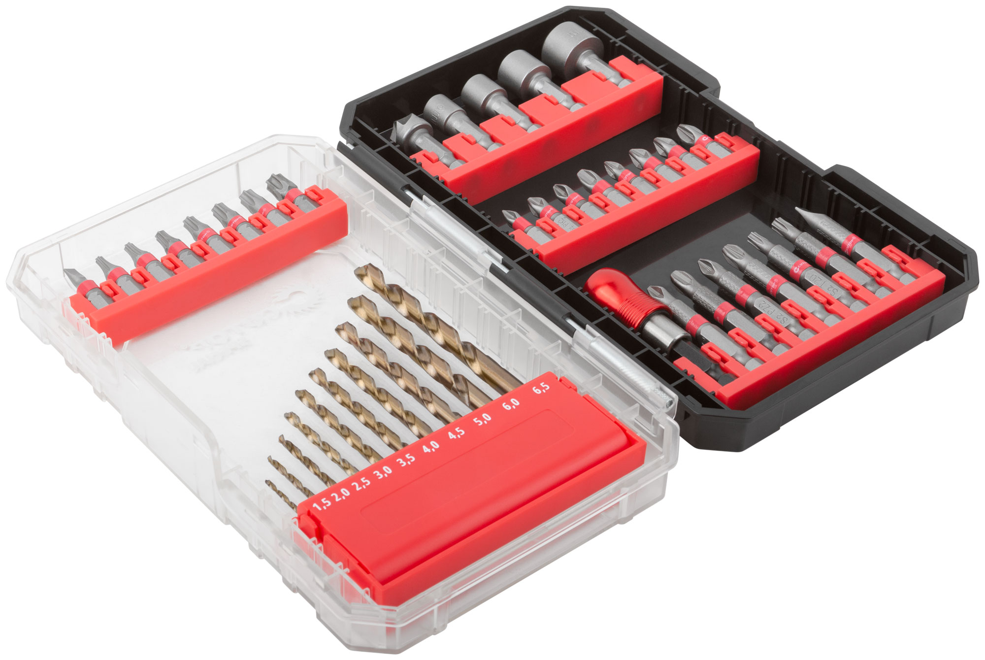 В комплект входят биты из тайваньской стали марки S2 и сверла из высококачественной стали типа HSS. Это позволяет выполнять сверления в углеродистых и легированных сталях, чугунах, цветных металлах и пластике. Удобная упаковка размером 270x240x35 мм позволяет легко транспортировать и хранить набор.