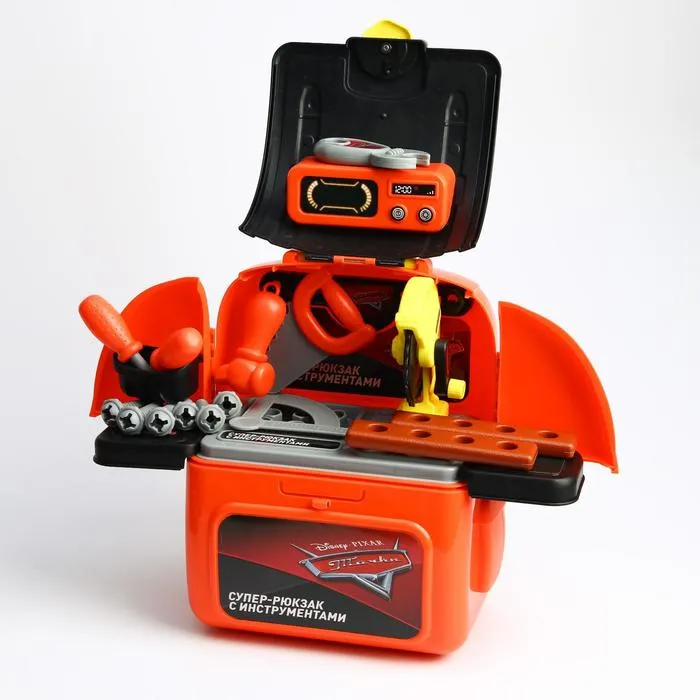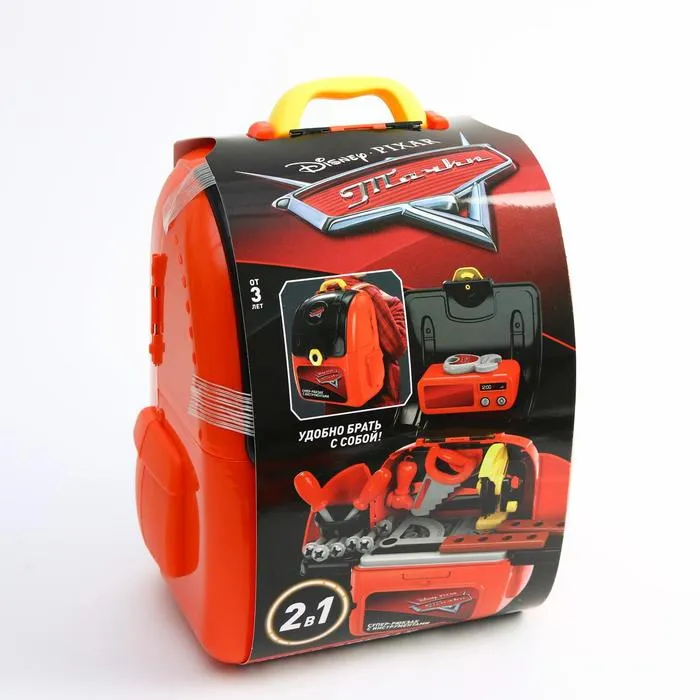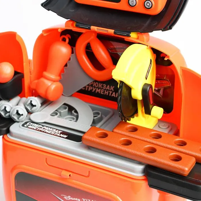 - Рюкзак 2в1 – мастерская всегда рядом: все инструменты надёжно уложены в яркий рюкзак с изображением любимых героев из «Тачек». Лямки делают его удобным для переноски, а вместительное отделение помогает поддерживать порядок. Теперь мастерская всегда под рукой, куда бы ни отправился юный механик!
