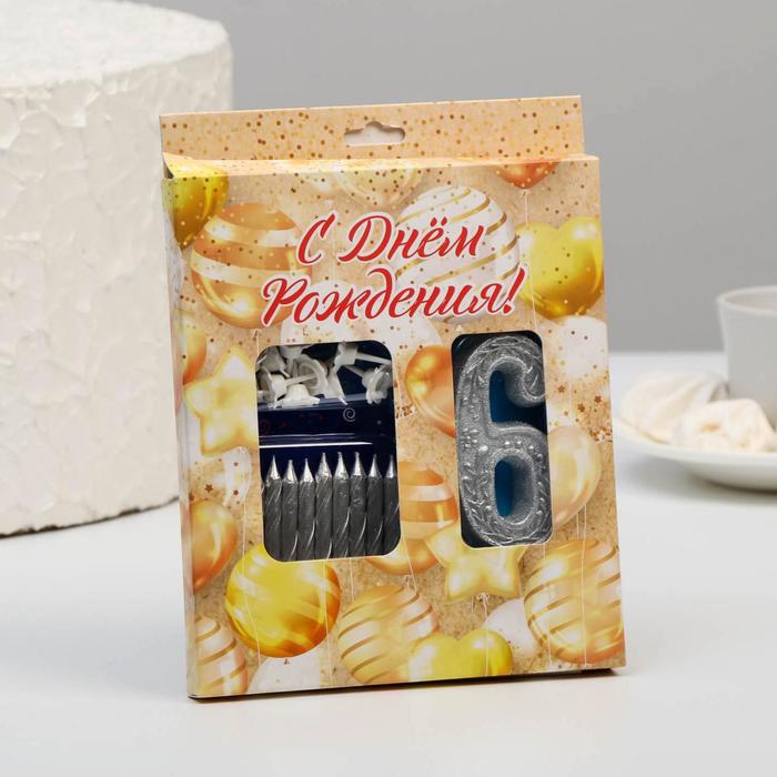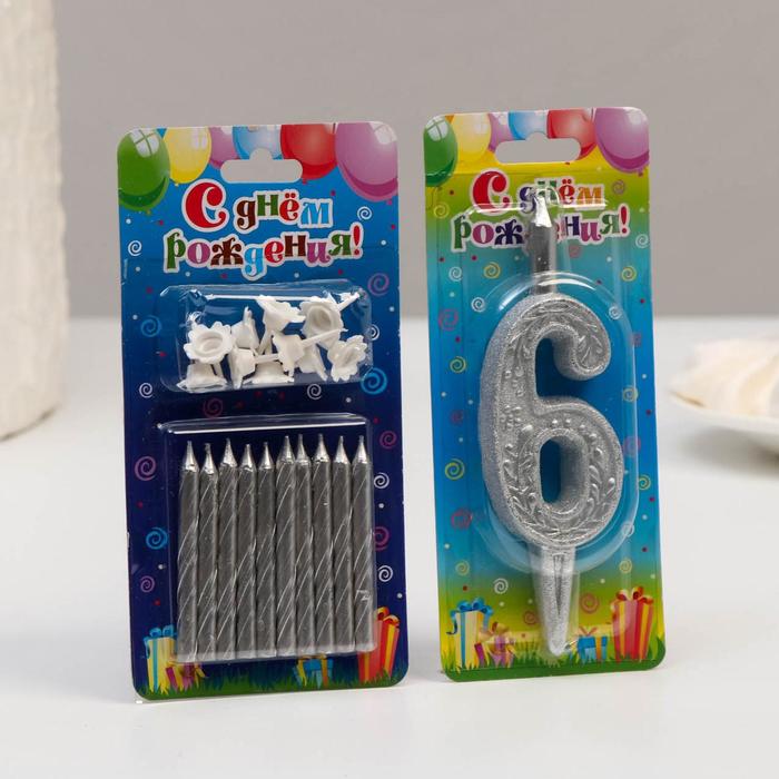 Набор свечей для торта (2 в 1) серебряный узор Цифра 6 + Свечи «С Днём Рождения» 10 шт., 12.5 см 71
