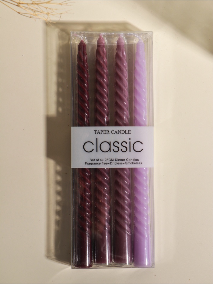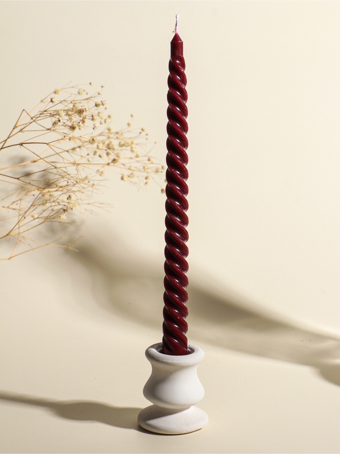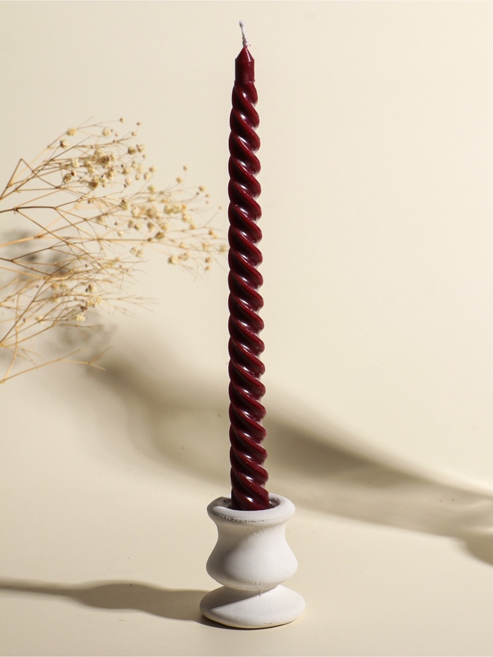 Этот набор витых свечей создаёт атмосферу уюта и спокойного торжества. Четыре высокие свечи насыщенного бордового оттенка стаятся в интерьере и при горении. Их плавные линии и глубина цвета придают пространству динамику и художественную завершённость.