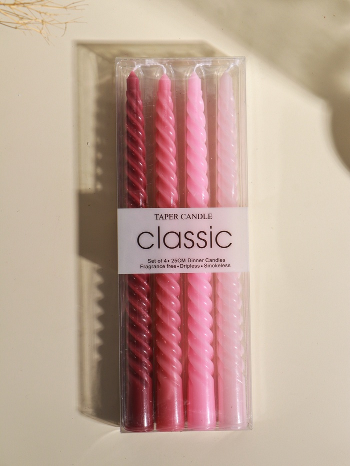 Этот набор из четырёх высоких витых свечей — готовое элегантное решение для создания уютной атмосферы. Их стройный силуэт и нежный розовый оттенок придают интерьеру особый шарм и теплоту.