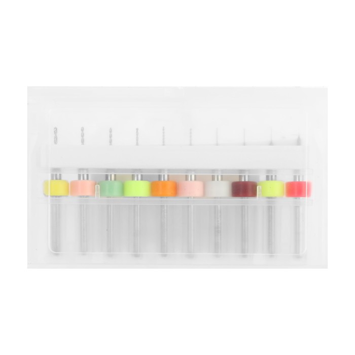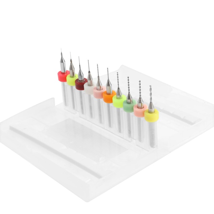 - Полный диапазон диаметров: В наборе 10 позиций от 0,1 до 1 мм. Это удобно при создании переходных отверстий, контактных площадок и точных технологических вырезов. Размер подбирается под конкретный элемент печатной платы – от микросхем до разъёмов.