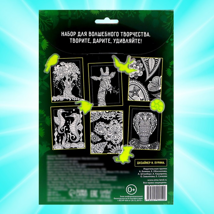 Набор для волшебного творчества увлечёт ребёнка и взрослого и позволит провести вечер творчески. В книге вы найдёте 6 картинок для раскрашивания, кисть, светящуюся краску и много светящихся наклеек.