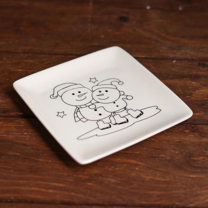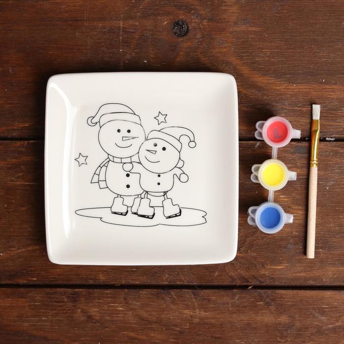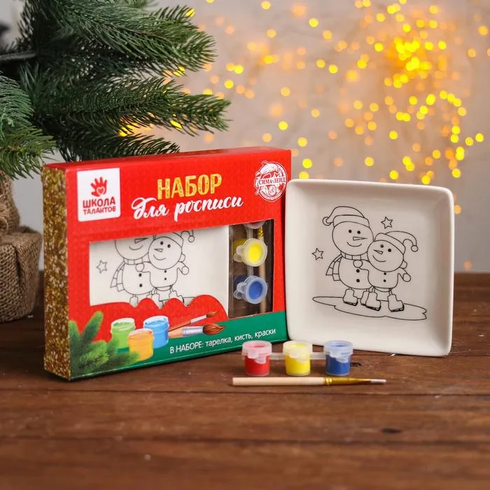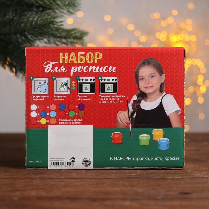 На тарелке нанесены контуры будущего изображения, которые крохе предстоит заполнить акриловыми красками. После высыхания они хорошо держатся на керамической поверхности, так что изделие можно будет мочить и даже разогревать в микроволновой печи.