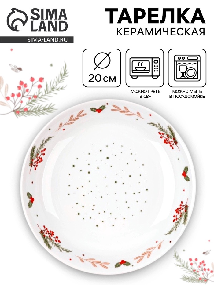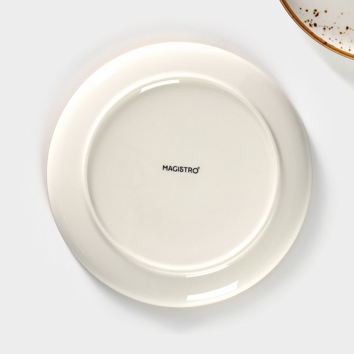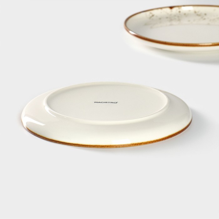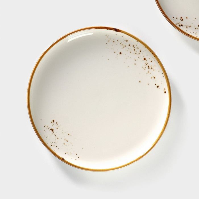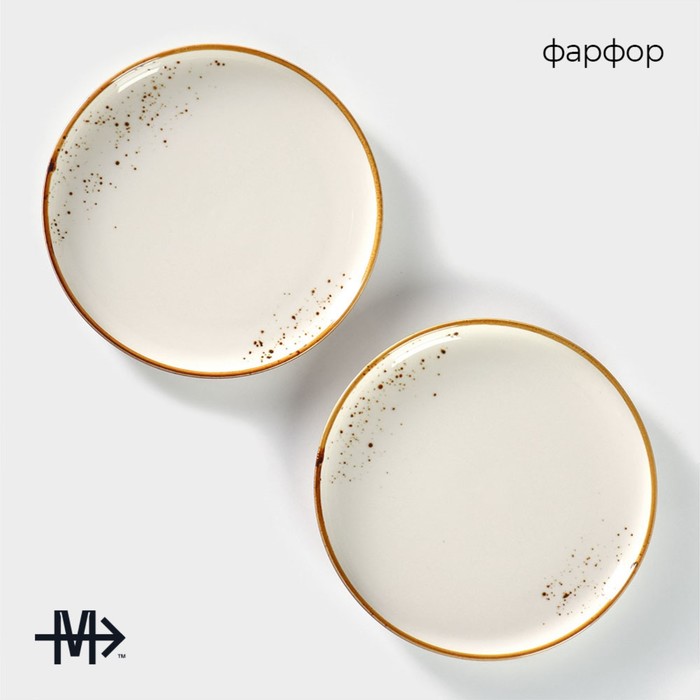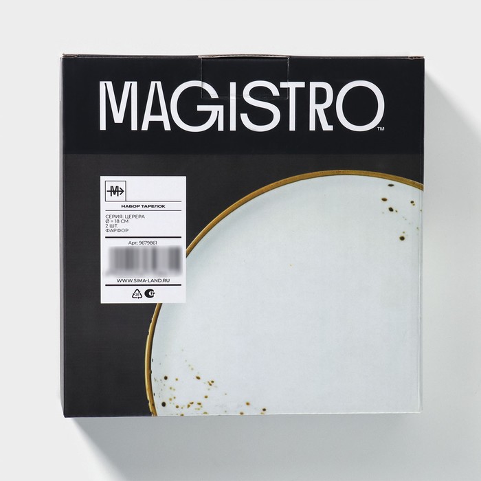 Десертные тарелки «Церера» от Magistro — пара белых фарфоровых кругов диаметром 18 см с аккуратным точечным рисунком для подачи сладкого, закусок или лёгких горячих блюд. Их плоская форма и умеренный размер делают их универсальными: они подходят и для пирожных, и для тостов, и для порционных десертов. Гладкая глазурованная поверхность сохраняет чистоту деколя даже после многократного мытья в посудомоечной машине, а фарфор спокойно переносит нагрев в СВЧ.