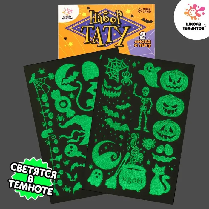 Набор тату — эффектное украшение для тела, которое дополнит ваш магический образ для Хэллоуина! В наборе 2 листа со светящимися переводками.