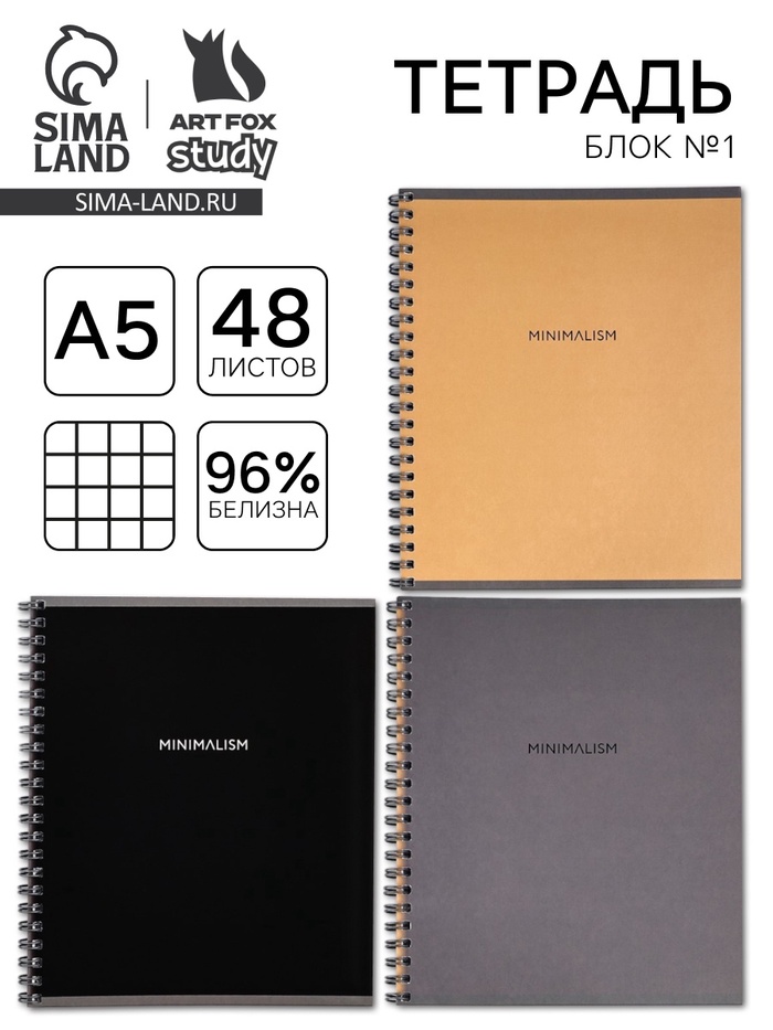 Тетрадь в клетку, 48 л., А5, на спирали, блок №1 «Минимализм» МИКС