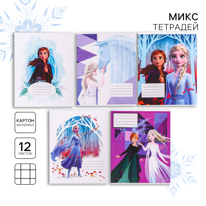 Тетрадь в клетку 12 листов, 5 видов МИКС, обложка мелованная бумага, «Холодное сердце»