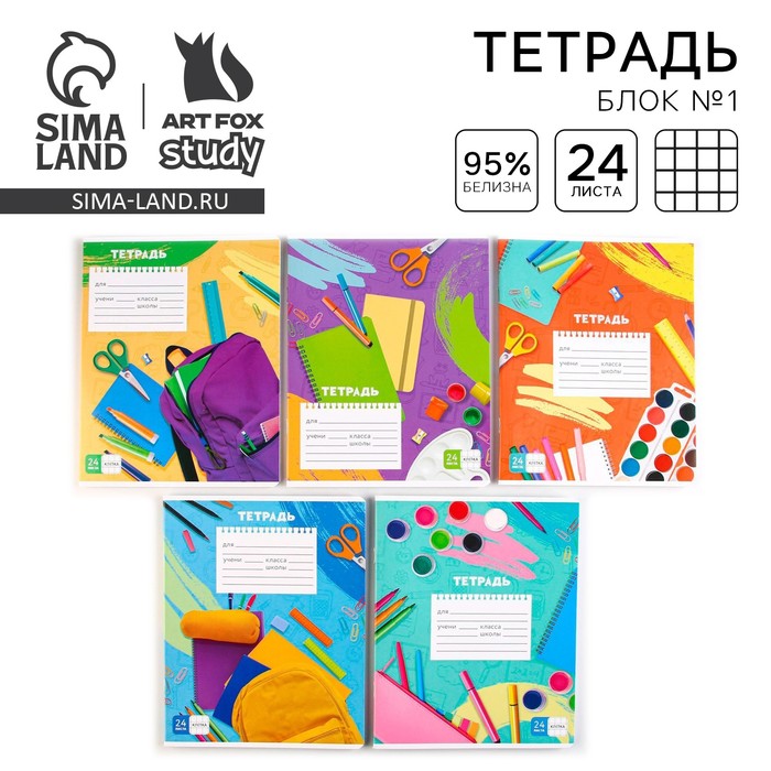 Тетрадь в клетку, 24 листа, А5, на скрепке, блок №1 «Школьные будни» МИКС