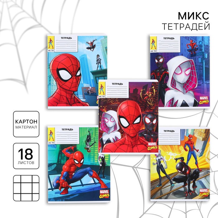 Тетрадь 18 листов, в клетку, МИКС 5 видов, обложка мелованный картон, «Человек-паук»