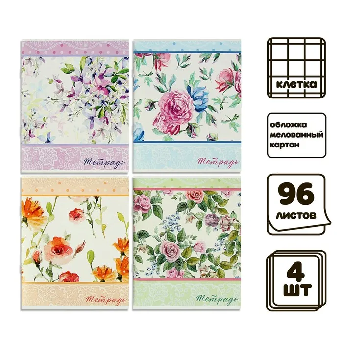 Набор тетрадей 96 листов в клетку Calligrata "Цветы-2", обложка мелованный картон, блок №2, белизна 75% (серые листы), 4 шт. — Характеристики