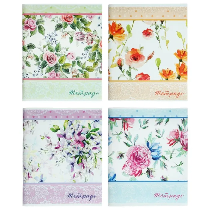 Набор тетрадей 96 листов в клетку Calligrata "Цветы-2", обложка мелованный картон, блок №2, белизна 75% (серые листы), 4 шт.