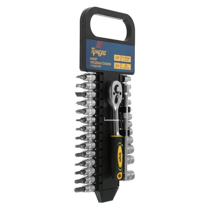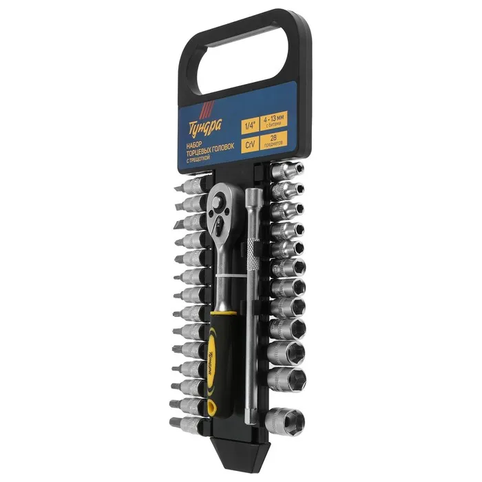 Набор торцевых головок ТУНДРА, трещотка, CrV, 1/4", 4 - 13 мм с битами, 28 предметов — Характеристики