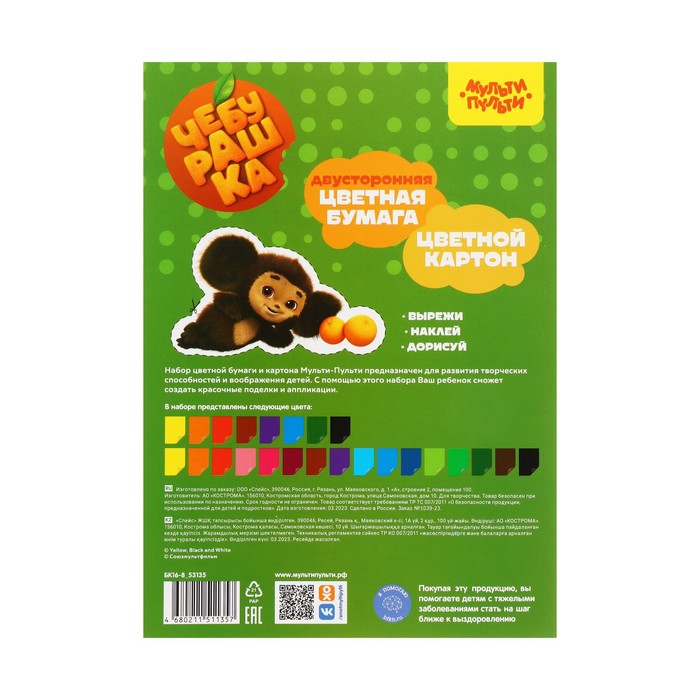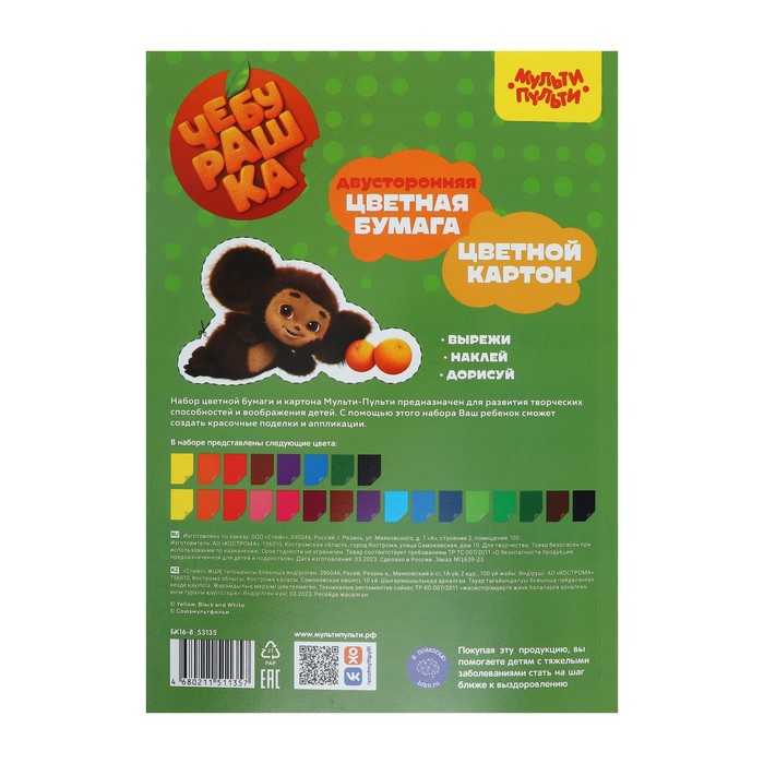 Набор цветного двустороннего картона "Мульти-Пульти" серии "Чебурашка" - это отличное решение для творчества! Дизайн обложки с любимым героем Чебурашкой обязательно понравится ребенку. На оборотной стороне есть персонаж, которого можно вырезать и сделать с ним поделку или аппликацию. В наборе используется высококачественный целлюлозный картон с двусторонним прокрасом. Лицевая сторона листа более глянцевая мелованная, оборотная сторона более матовая. Размер: 200 х 280 мм. Плотность: 210 г/м2. Набор включает в себя 10 листов мелованного картона 10 цветов. Обложка набора выполнена из качественного целлюлозного картона. Для детей старше 3-х лет.