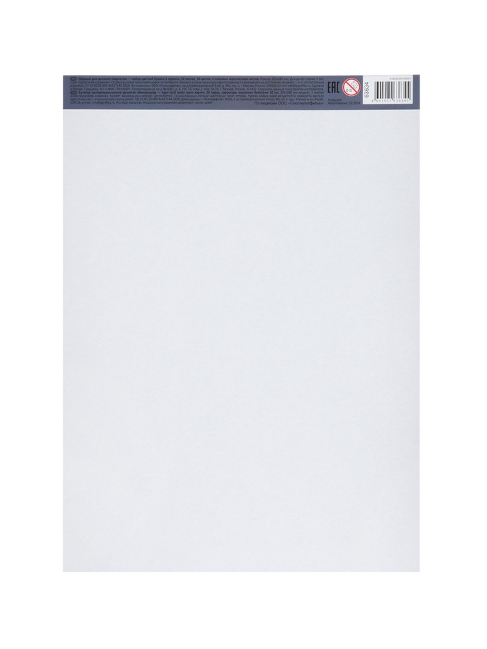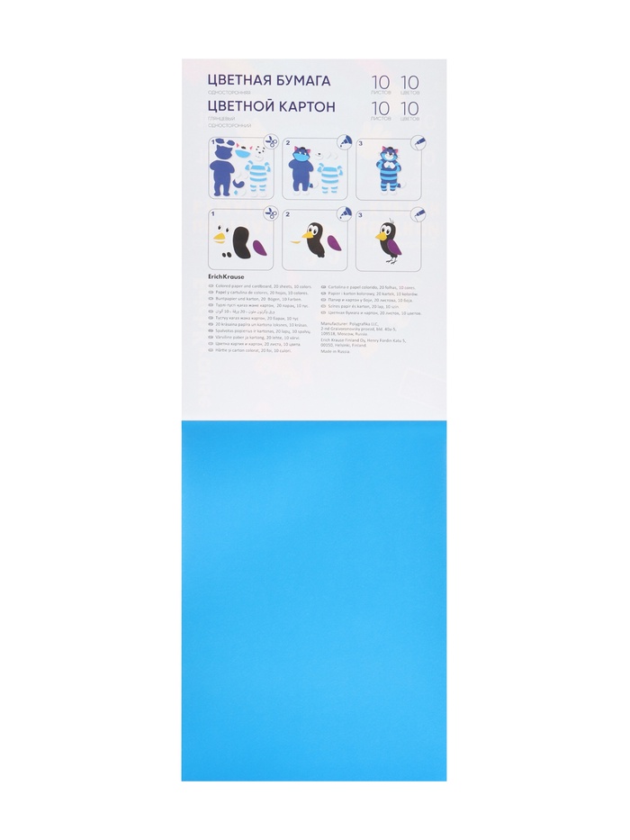 Набор цветной бумаги мелованной односторонней и картона глянцевого одностороннего формата А4 (203х280 мм). В наборе 20 листов бумаги и картона 10 базовых цветов (красный, оранжевый, желтый, зеленый, голубой, синий, фиолетовый, розовый, коричневый, черный). Плотность наполнения: бумага - 80 г\м2, картон — 170 г/м2. Тип скрепления — клей. На внутренней стороне обложки приводятся инструкции по изготовлению поделок.
