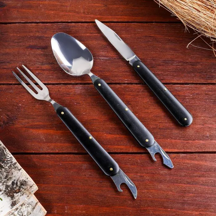 Набор туриста в чехле 5в1 Мастер К, черный неотъемлемая часть любого пикника. Универсальный нож позволит нам с легкостью нарезать фрукты и овощи, открыть банку, бутылочку вина или лимонада, съесть шашлык или любимый десерт. Компактный нож сэкономит в рюкзаке место для более крупных вещей при этом останется востребованным на протяжении всего времени.