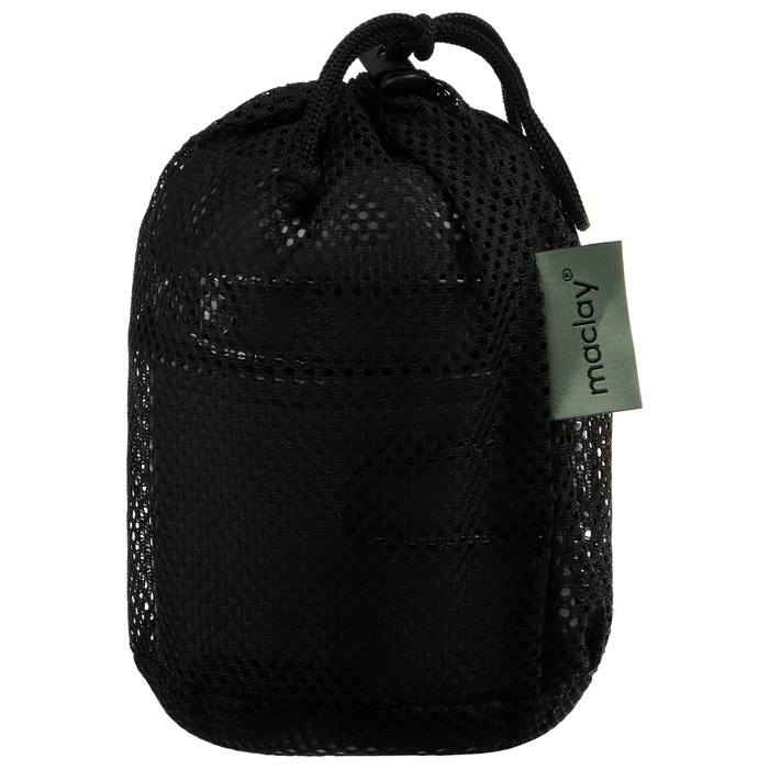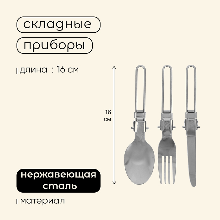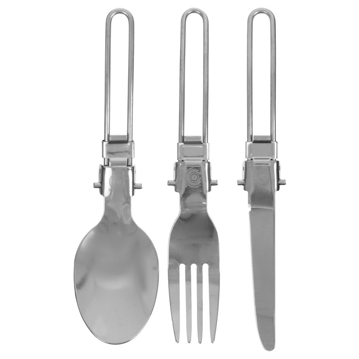 Набор включает в себя 2 кастрюли, складную вилку, ложку и нож. Упакован в сетку-чехол.