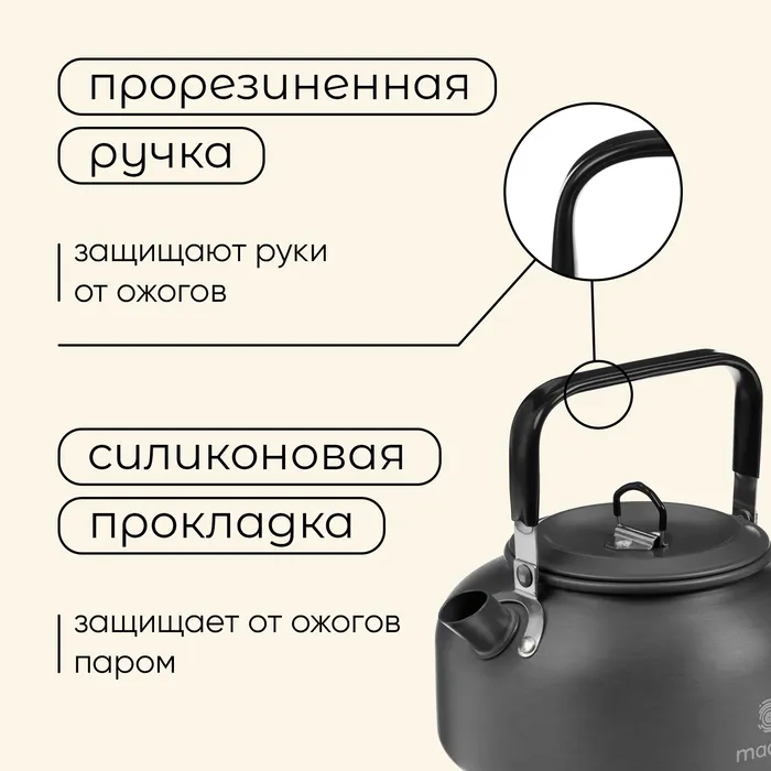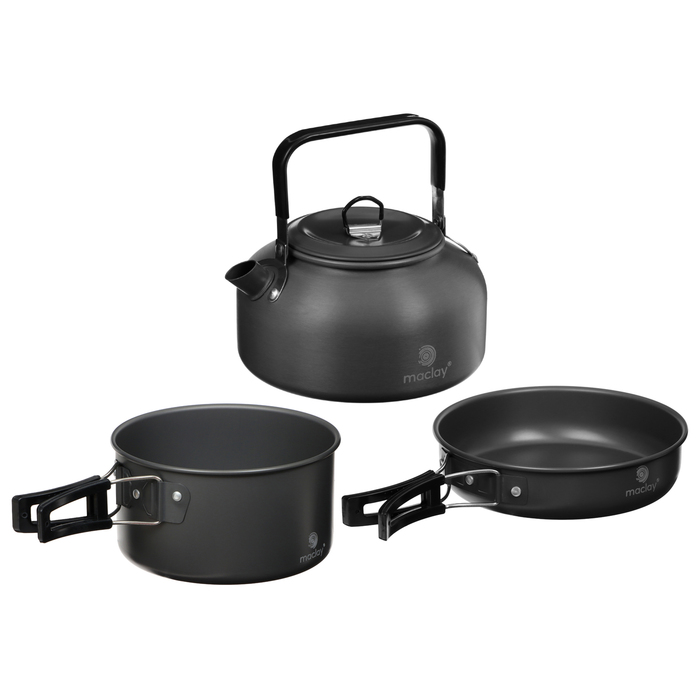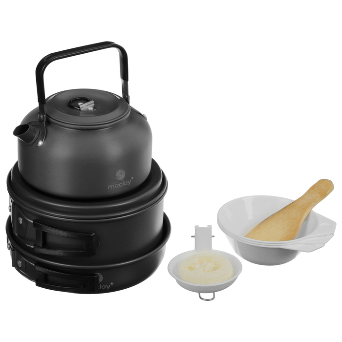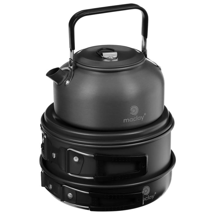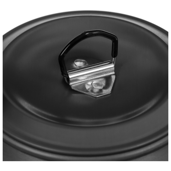 Набор походной посуды из анодированного алюминия позволяет соединить в себе приготовление еды и напитков. Имеет откидные переносные ручки с термоизолирующим покрытием, которые экономят объем при транспортировке, делая использование посуды более комфортным.