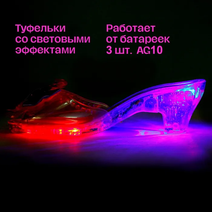 - Туфельки со световыми эффектами. Для работы необходимы 3 батарейки типоразмера AG10. Батарейки входят в комплект.